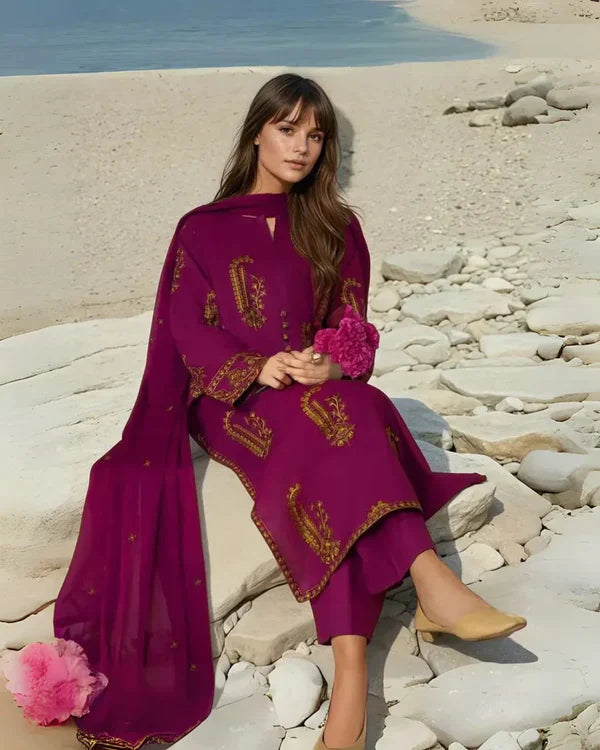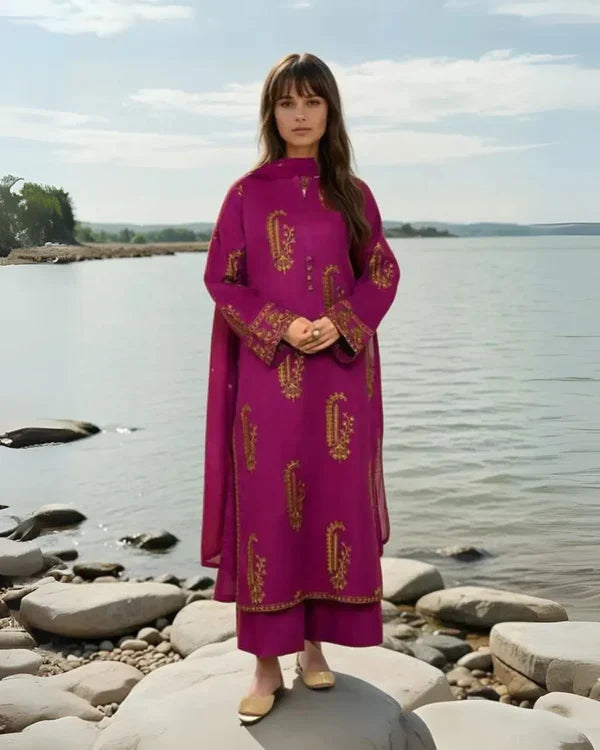 Wrap yourself in warmth and elegance with the Amber 2‑Piece Winter Suit. The deep magenta linen shirt, adorned with intricate golden embroidery, exudes timeless charm while the plain matching trousers keep the look refined and easy to style. Ideal for cozy winter gatherings or elegant daytime outings, Amber blends traditional artistry with modern comfort.