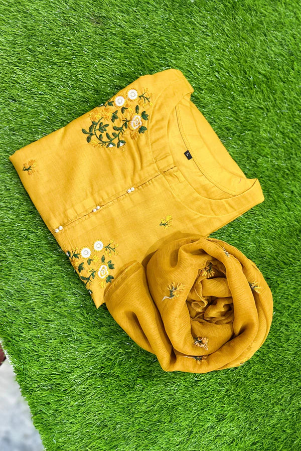 Mustard Hill, a stunning -piece suit from Libbas crafted in premium winter linen. The rich mustard-toned shirt features delicate embroidered detailing, adding a touch of sophistication to its vibrant hue. Paired with a plain trouser   , this ensemble blends warmth, comfort, and timeless charm.