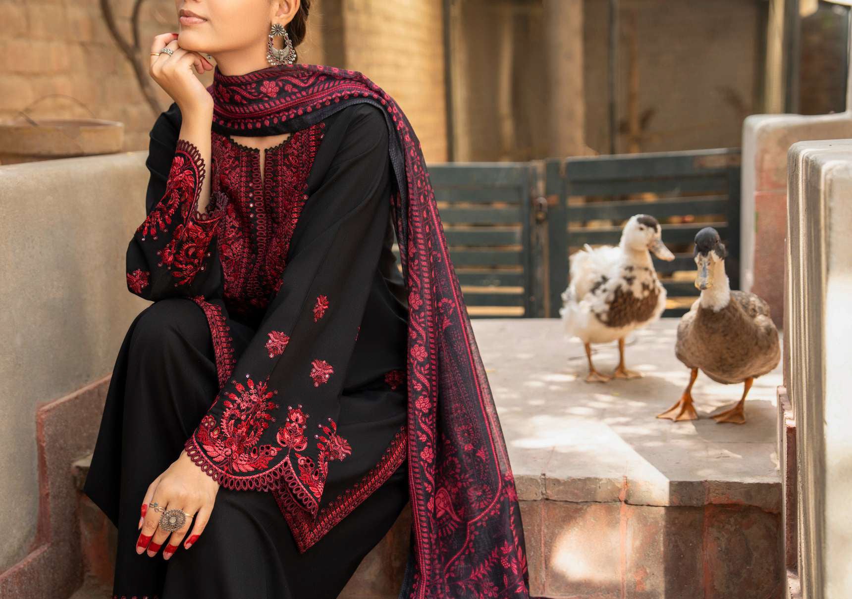 Exuding timeless sophistication and grace, this black 3-piece embroidered ensemble is crafted for women who appreciate regal charm and effortless style. Each element of this outfit reflects refined artistry and modern poise.
